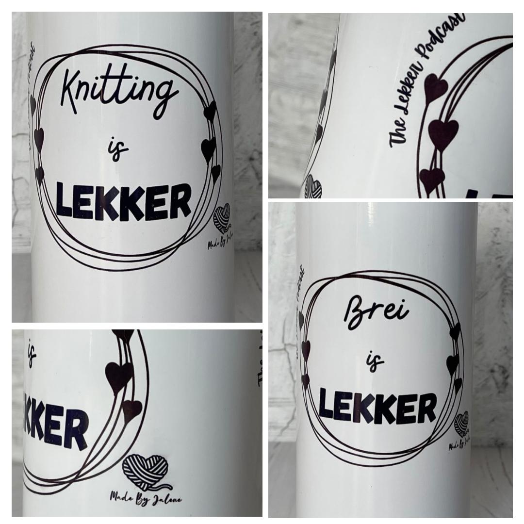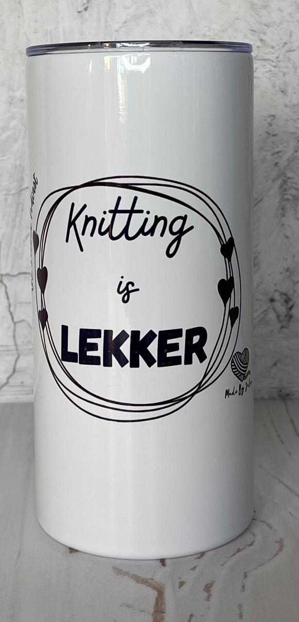 Double-Walled skinny 440ml tumbler branded with Made by Jalene – (Afrikaans and English “Brei is lekker / Knitting is lekker”)