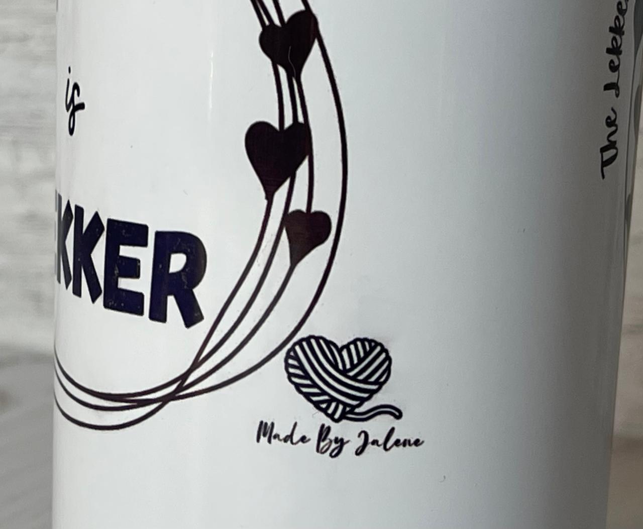 Double-Walled skinny 440ml tumbler branded with Made by Jalene – (Afrikaans and English “Brei is lekker / Knitting is lekker”) These tumblers are designed to maintain the temperature of your beverages, keeping them cold or warm for hours! Comes with a slide-close lid and plastic straw.
